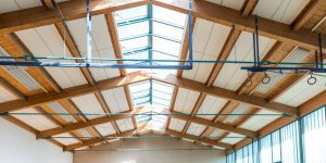 Modernisierung der 5-geschossigen Heide-Grundschule. Hier waren wir beauftragt mit dem Einbau der Decken in diversen Räumen, Fluren und der Turnhalle.