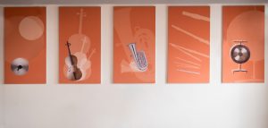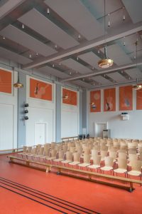 Sanierung der 2-geschossigen Aula der musikbetonten Grundschule im 2.OG. Hier wurden Akustikdeckensegel und Akustikwandpaneele sowie Lichtvouten als Sonderkonstruktion montiert