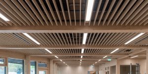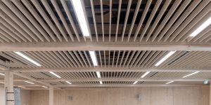 Neben dem Trockenbau wurden wir mit dem Einbau einer akustisch wirksamen, abgehängten Decke aus Holzwolleleichtbauplatten und mit der Montage einer Holzlamellendecke, einschließlich Unterkonstruktion, beauftragt.